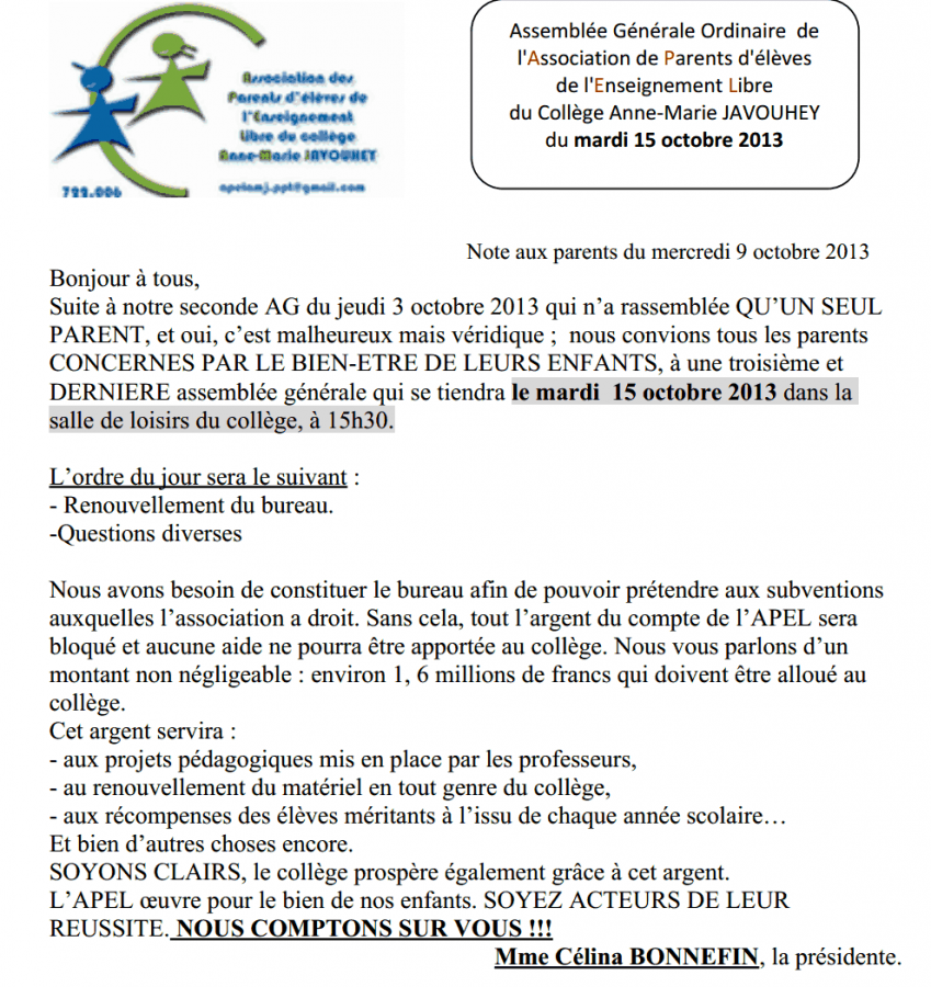 | 2e réunion APEL (posté le 01/10/2013 à 20:15) |