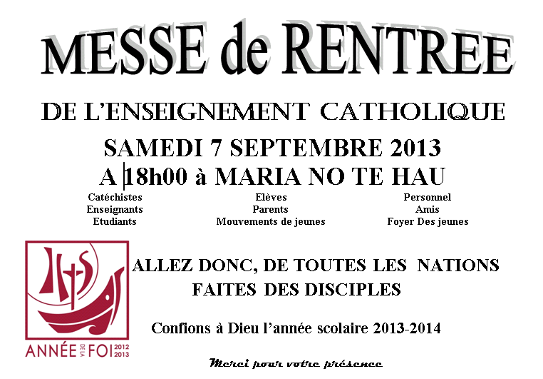 Mercredi 12 Juin, célébration eucharistique à Maria No Te Hau. La messe débutera vers 08h20. Code vestimentaire: filles et garçons aux couleurs bleu ou blanc (pas de jupes courtes ni de shorts très courts) |