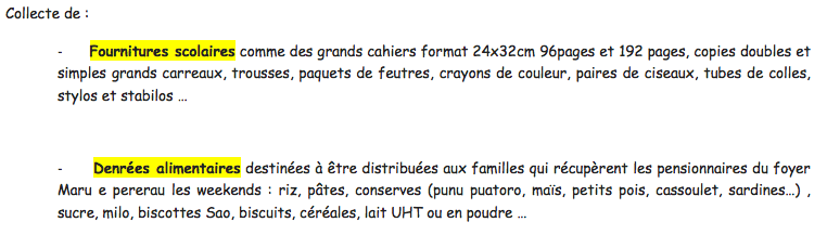 Une opération de solidarité nommée "Une rentrée pour tous!" sera menée du 29 Août au Jeudi 12 Septembre 2013 afin de récolter des fournitures scolaires et des denrées alimentaires à distribuer à nos élèves défavorisés, aux enfants du foyer "Maru e pererau" (dirigé par Soeur Marie Joseph) et aux familles de ces enfants.