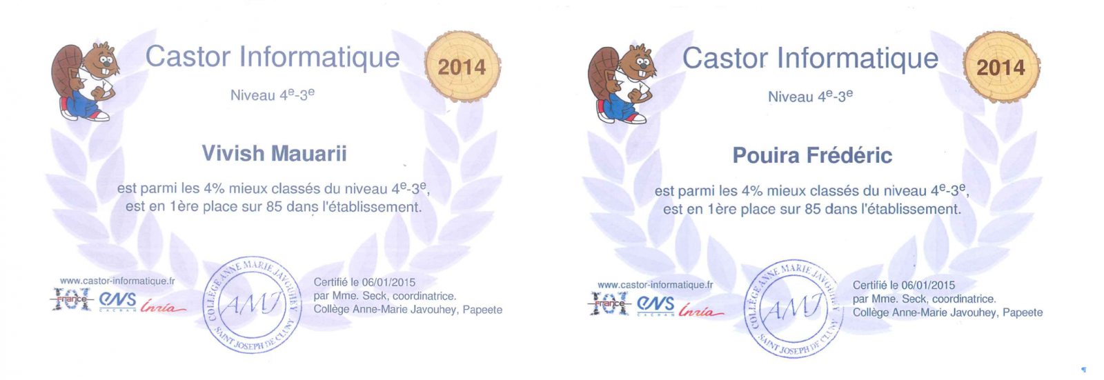 Félicitations à nos élèves de 4e pour les brillants résultats au concours Castor. Classés parmi les meilleurs (4%) au niveau national (sur 81 400 candidats). Le concours couvre divers aspects de l'informatique : information et représentation, pensée algorithmique, utilisation des applications, structures de données, jeux de logique, informatique et société.