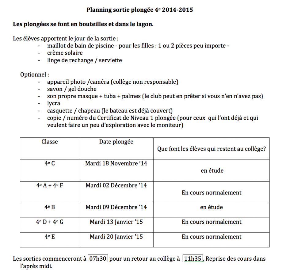 Modification : La sortie plongée de la 4e B est décalée au Mardi 27 Janvier 2015