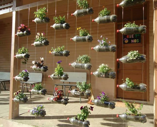 Nous récupérons aussi vos anciennes bouteilles plastiques de 1,5L afin de réaliser des supports pour des plantes suspendues (exemple ci-dessous). Merci de les déposer auprès du bureau des surveillants si vous en avez.