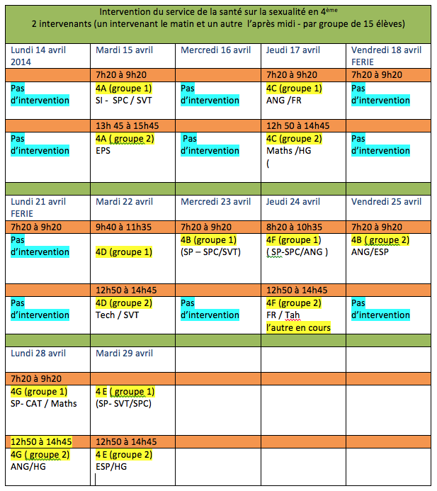 Les services de la santé feront une opération prévention sur la sexualité en 4e du 15 Avril au 29 Avril. La présentation se fera en 1/2 groupe de 15 élèves (matin/après midi) avec 2 intervenants.